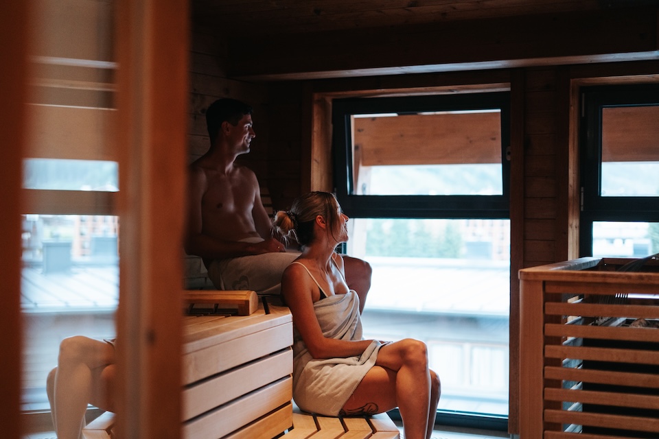• In der Sauna im Glemmtal entspannen zwei Personen, eine in gelbem Regenmantel, der andere bereit zum Saunieren.